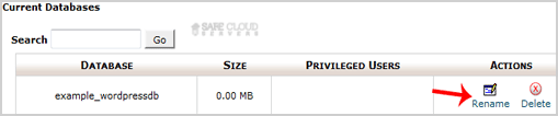 3. Under "Current Databases", You can see list of your all databases. Locate the Database and then click on "Rename" Icon.