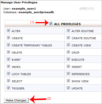 5. On "Manage User Privileges", mark the box "ALL PRIVILEGES" and click on "Make Changes".