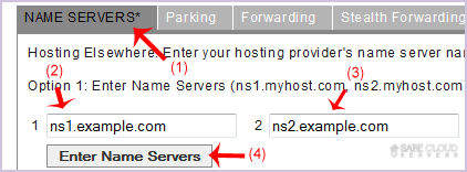 6. To add new name servers, look at Option 1. Enter your two name servers in the provided text boxes, and then click the "Enter Name Servers" button to save your changes.
