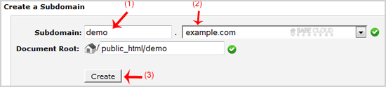 3. Under "Create a Subdomain" in the "Subdomain" field you should enter your subdomain name like "demo"(without quota) and should you have a number of domains, select the appropriate domain from the dropdown list.