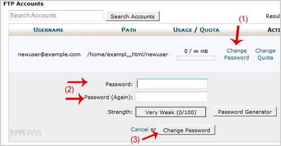 3. Under the "FTP Accounts" list, click on "Change Password" or use the "Password Generator".