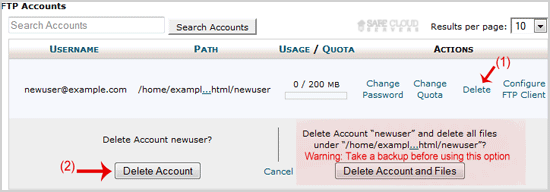 4. Click on the "Delete Account" button and your FTP Account will be removed.